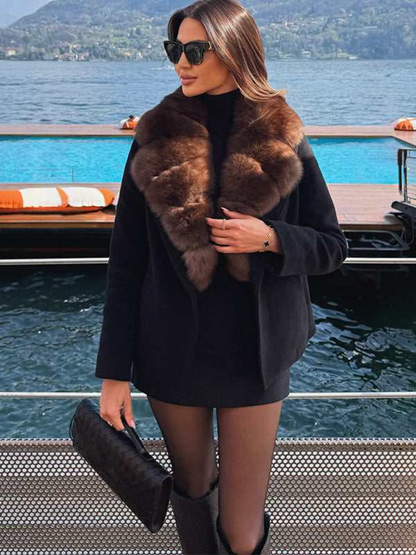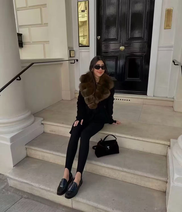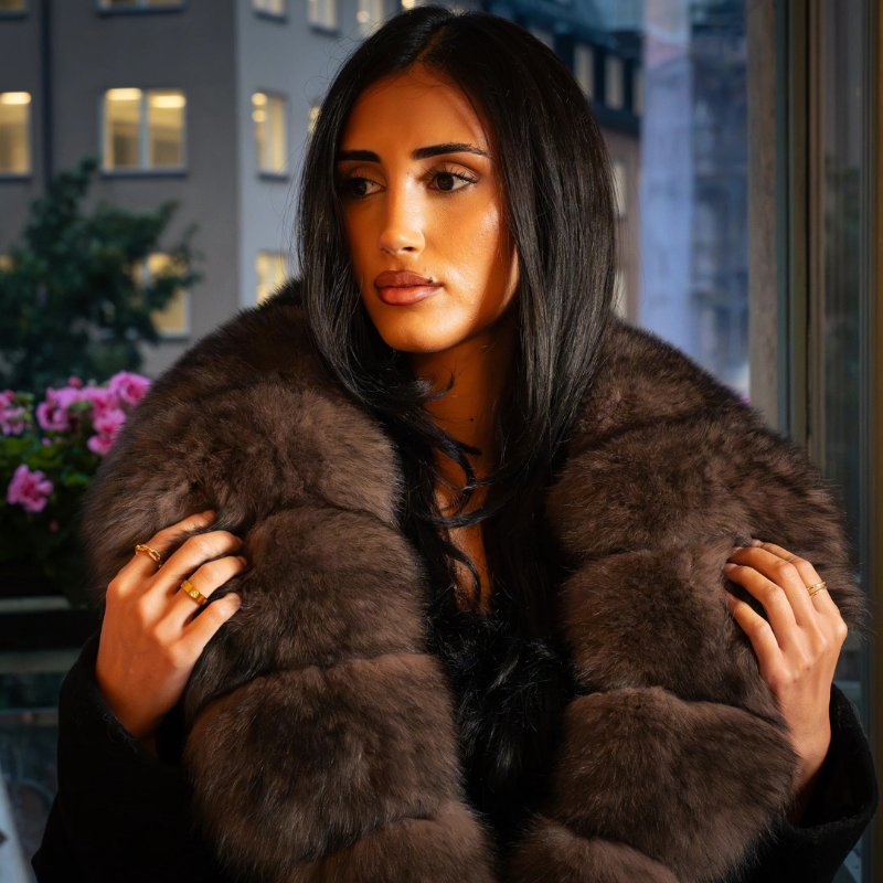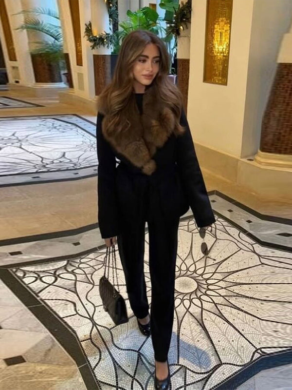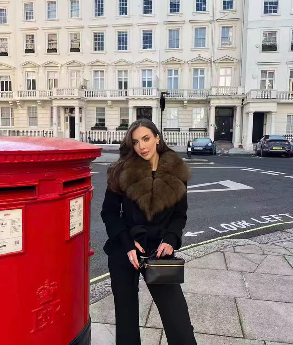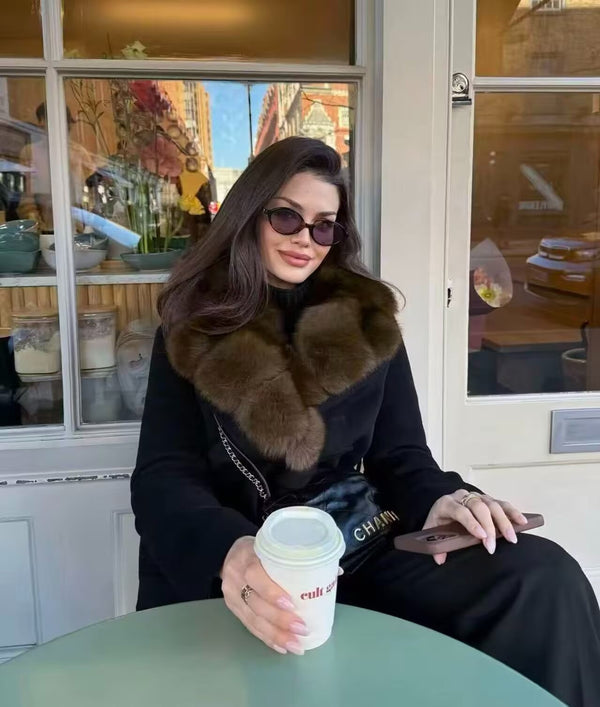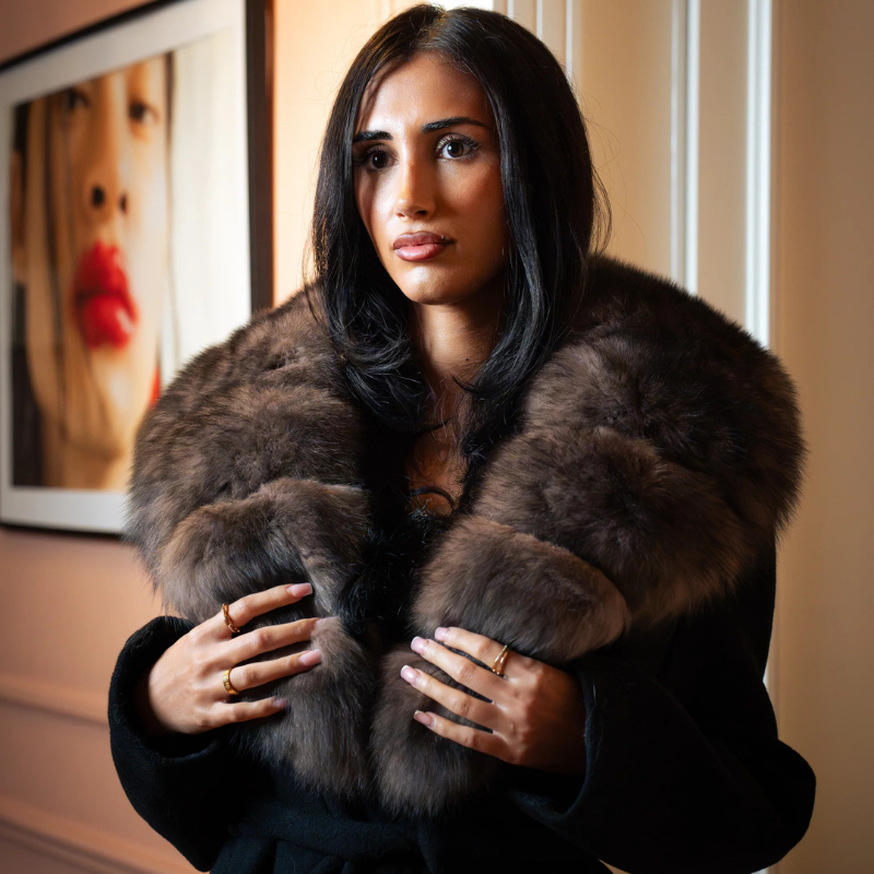 A wrap-style design with fox fur collar and cashmere blend, this coat feels both grand and effortless, designed for moments when warmth and presence matter most.